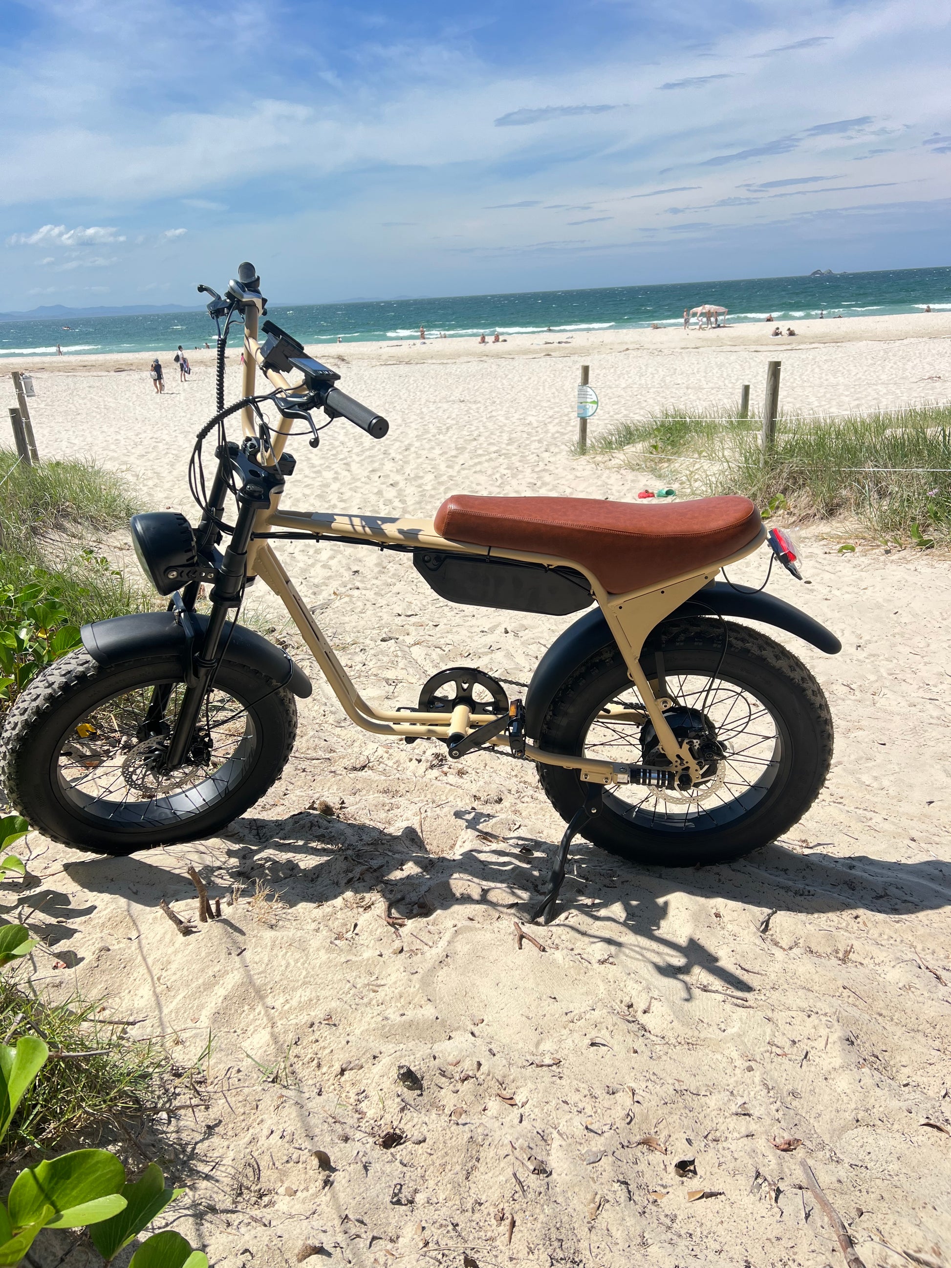 iconic design, this high-performance electric bike combines retro styling with modern electric power. With 20x4.0” all-terrain tires, full suspension, and a rugged frame, it's built for adventure—whether you're commuting through the city or cruising on the beach.
